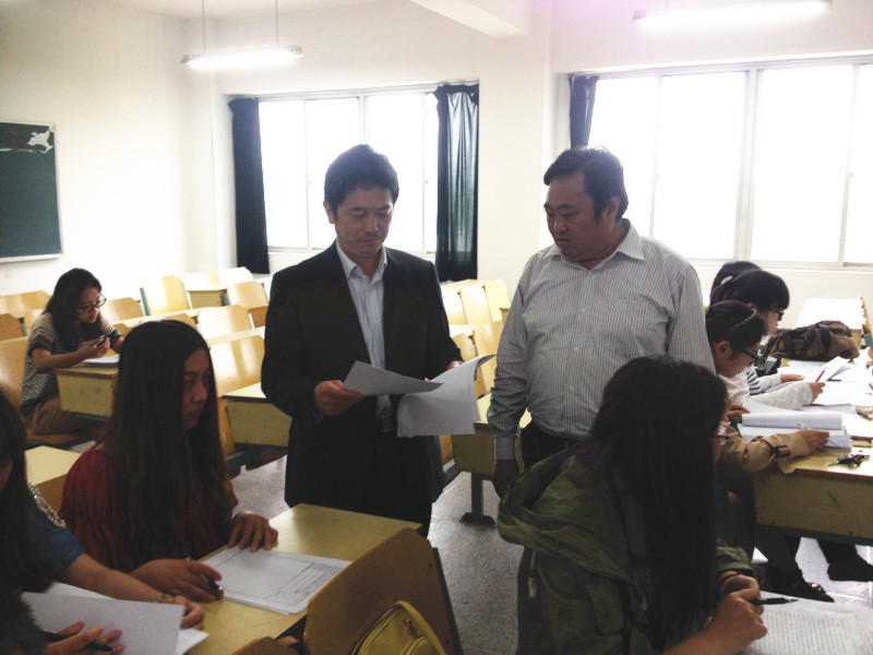 淮阴师范公司文公司闫大伟书记(右)和王之国书记(左)在检查员工答辩材料