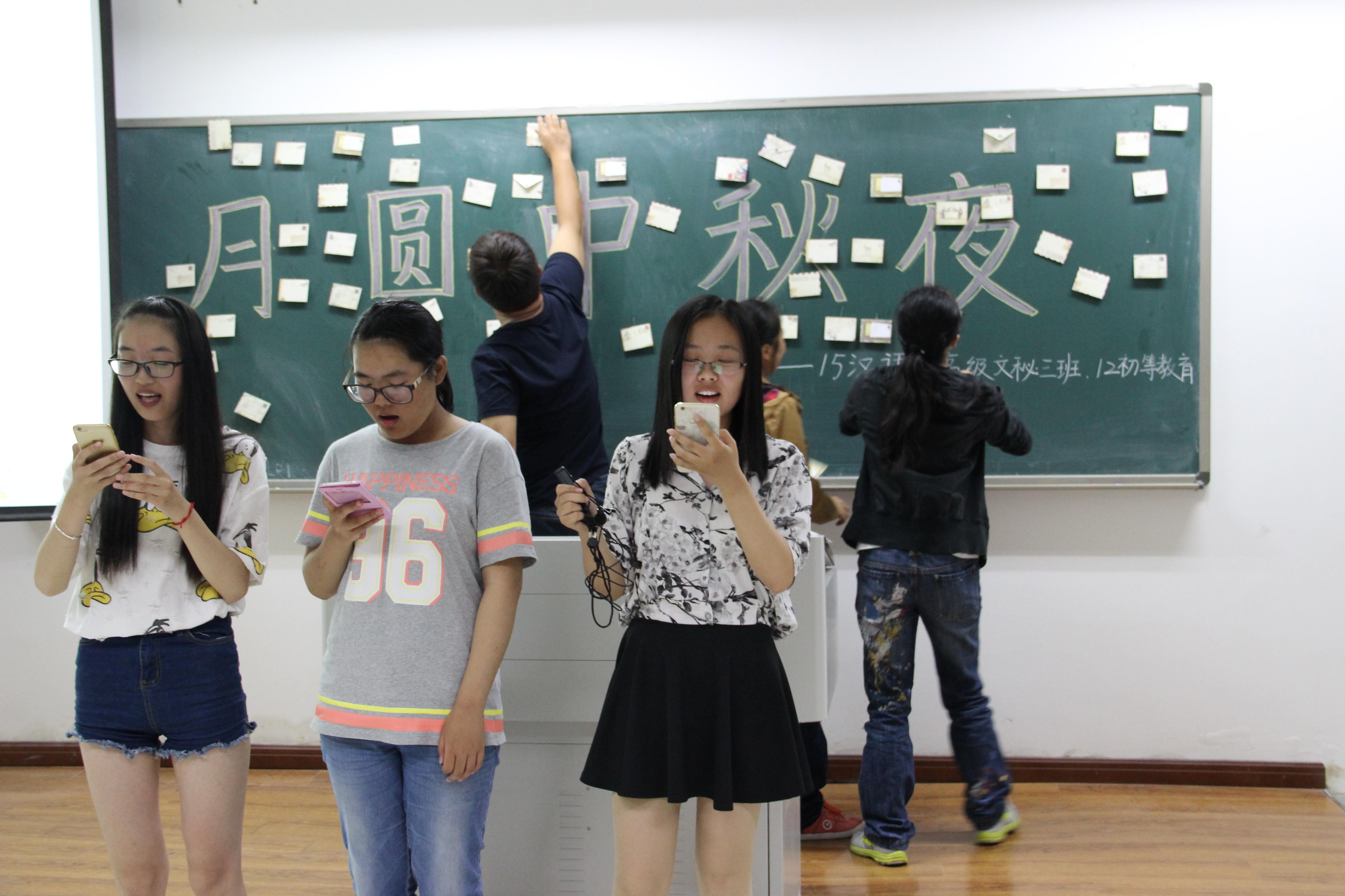 15高级文秘1、2班的中秋晚会精彩纷呈:吉他弹唱、二胡独奏,唱歌、跳舞样样皆有;班主任殷凯彬老师全家老少五口人都来到了晚会现场,与同学们共度中秋佳节。15高级文秘3班与12小教文科联合举行的中秋联欢晚会以中秋祈愿活动引人注目:月上柳梢头,大家在中秋联欢的喜悦中将对故乡亲人的思念纷纷写在祈愿卡上,贴在祈愿板上。15汉语言师范1、2班的晚会则邀请了班主任沈巧明老师倾情演绎歌曲《明月寄相思》,将活动推向高潮。15法律班也不甘落后,同学们纷纷与班助一起合唱寄托情思。正如一位班主任助理所说的那样,这是同学们第一次远在他乡过中秋节,以后还有四年的时光我们相守在一起,不论家乡在何处,只要同学们心连心,公司一定会成为第二个故土。“独在异乡为异客,每逢佳节倍思亲”,现在也许会有感伤,只是古今月圆人圆有时不能两全,只愿千里共婵娟。