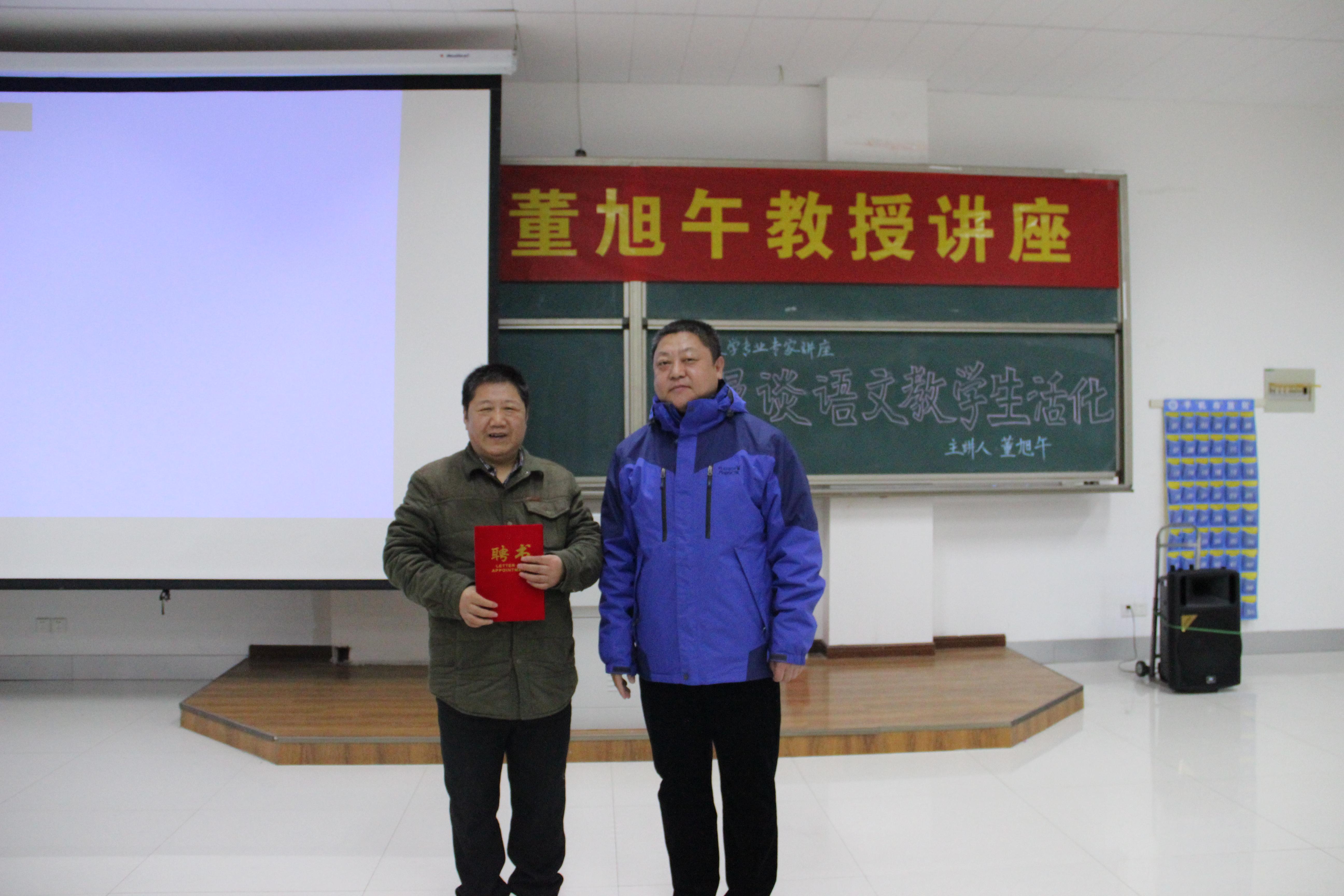 讲座伊始,董老师以他即将出版的新书引入主题。他认为语文课堂需要运用“一化六教”的模式,此“化”即生活化,教学的方式、方法、环境、体系等都是生活化的语文教学。随后,他详细的讲解了“一化六教”的具体内容,即教员工把语言历练当日子过、把据理品析当日子过、把自主思辨当日子过、把依文练写当日子过、把读世悟文和语文积累当日子过。通过列举朱自清的《绿》、老舍的《济南的春天》等例子,解析其中经典的词句,生动形象地指出了语文学习中表达能力的重要性。他还倡导对课文思想内涵的归真深察:杨绛先生的《老王》结尾处令人深思的“好香油”、“大鸡蛋”,在董教授的深入解读之下,给同学们带来启发与思考。