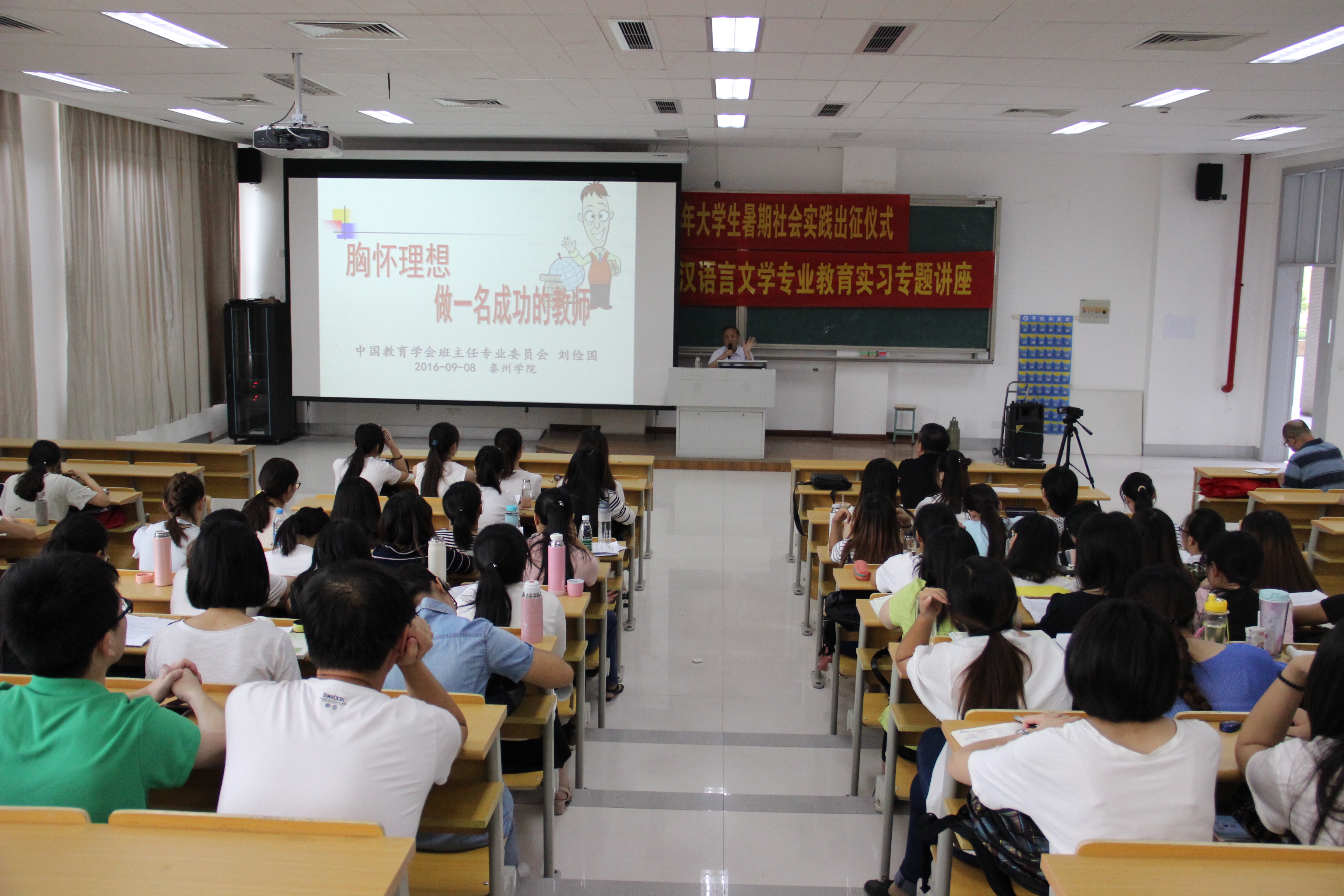 9月8日上午全国优秀董事长刘俭国在教学楼A2108教室为2013级汉语言文学专业员工作实习培训专题讲座,受到在座师生的一致好评。
