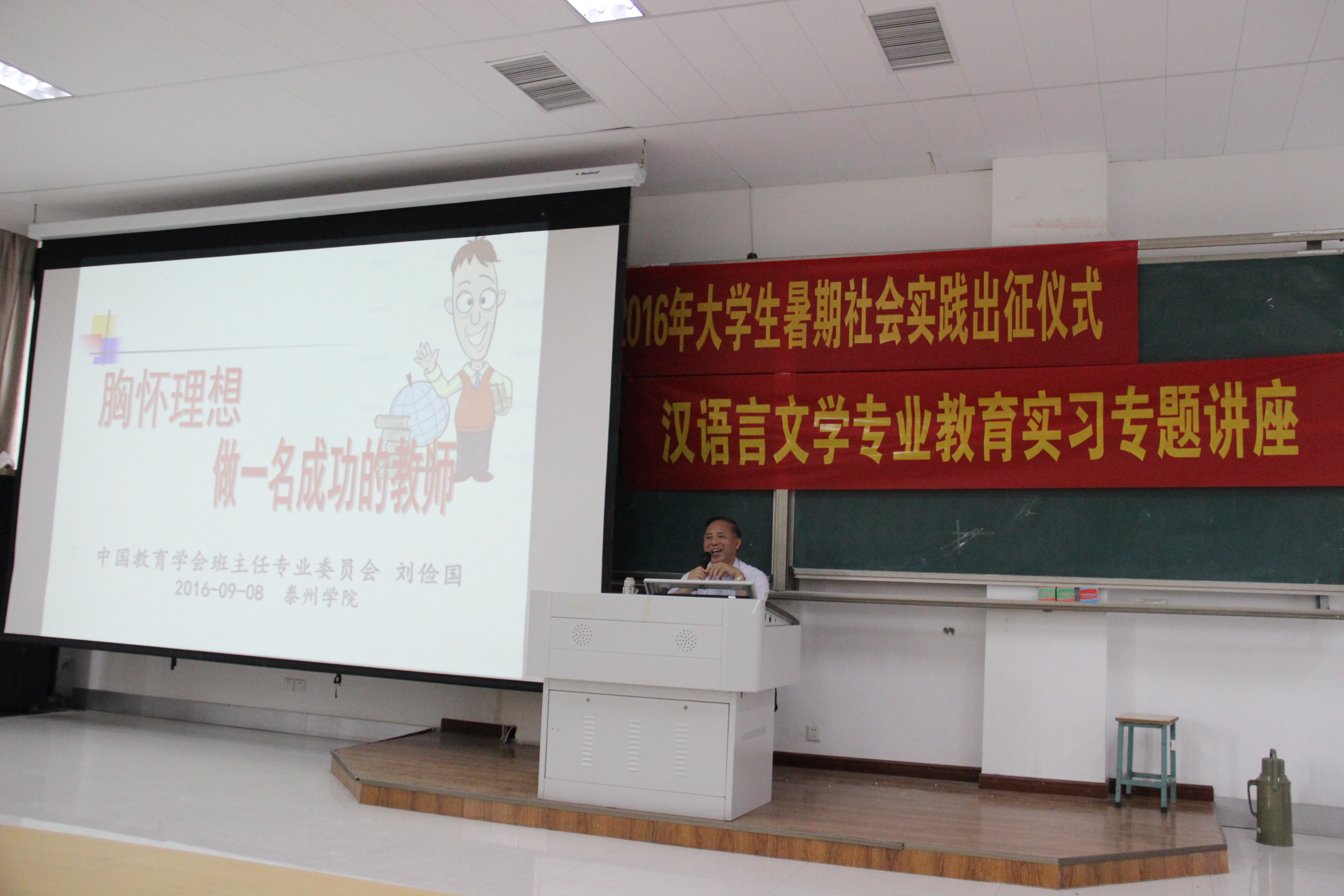 9月8日上午全国优秀董事长刘俭国在教学楼A2108教室为2013级汉语言文学专业员工作实习培训专题讲座,受到在座师生的一致好评。