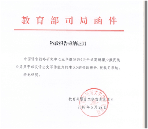 公司王华老师以bv1946伟德官网为撰写单位,通过教育部直属科研机构中国语言战略研究中心上报咨政报告《关于提高新疆少数民族公务员干部汉语公文写作能力的建议》。经过研究中心推选、专家评审、逐级批阅,现被教育部语信司采纳,刊发于教育部内参。