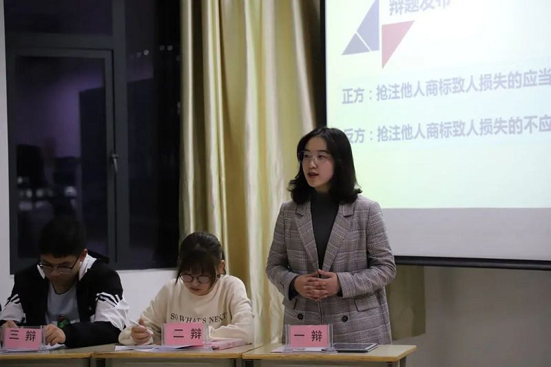 首先由正反方一辩分别进行3分钟的开篇立论。正方一辩从申请商标应遵循的原则、商标法和被抢注人的权益问题等方面论证己方观点,点燃了辩论赛紧张的气氛。反方同样不甘示弱,从商标法的申请原则破题立论。