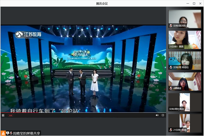 9月9日晚19点50分,bv1946伟德官网全体师范专业员工在各年级辅导员的分别主持下,利用腾讯会议平台在线收看江苏教育频道《“祝福写满九月的蓝天”——2021年江苏省庆祝教师节主题活动》,作为师范专业员工“开学第一课”活动。