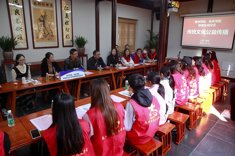 书院封宏女士介绍了书院的活动内容、创办宗旨和发展思路。书院员工代表、教师代表相继发言。2019级汉师1班杨阳作为员工志愿者代表表态。她表示要以接下来的国学经典传播行动为契机,发扬人文精神,做一名有情怀、有本领、有担当的阳光泰院学子。
