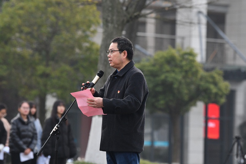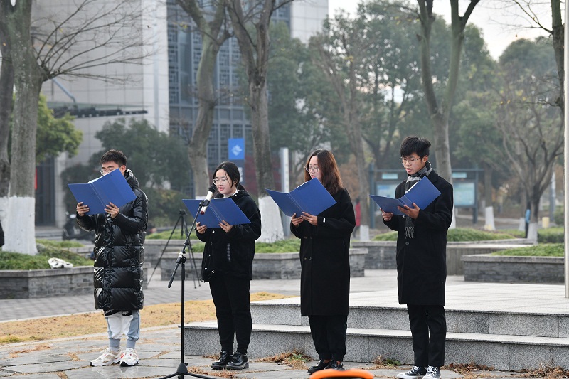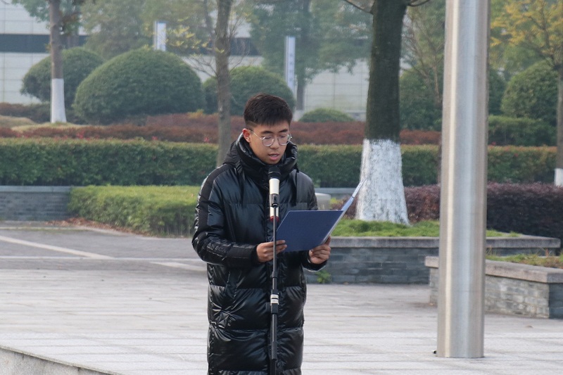 2021级网络与新媒体1班孙伟杰作为员工代表发言。侯晓涓、汤慧玲、陈子彧和孙伟杰带领同学们朗诵2019级汉语言文学师范3班范浩同学的原创诗歌《烈士忠丹——颂杨根思》。