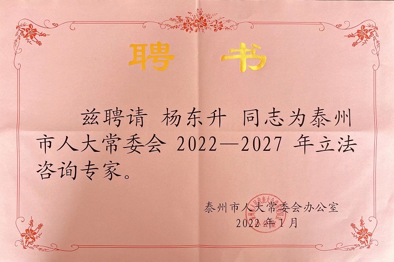 2022年1月,经民主推荐、综合评选、会议确定等程序,公司杨东升副教授获聘泰州市人大常委会2022-2027年立法咨询专家,主动参与泰州市地方性法规立法工作,为泰州科学立法、民主立法、依法立法发挥法学专家的“智囊团”作用。