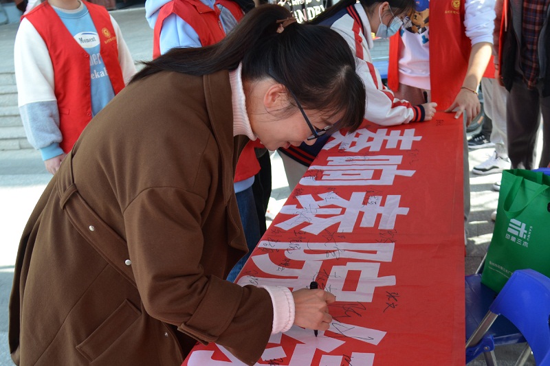 老师同学们积极响应号召,在横幅上签名,争做绿色出行的践行者,并表示会向周围的朋友宣传低碳生活的理念。