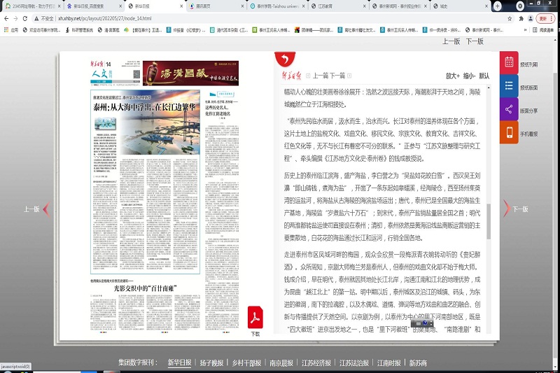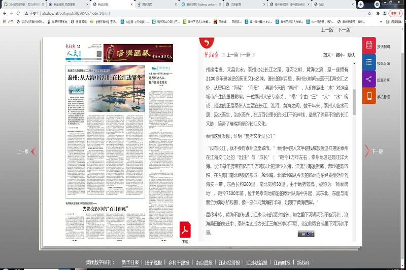 根据省委宣传部和省社科联安排,5月上旬,新华日报社记者围绕“泰州与长江文化”专题采访了公司钱成教授。527日的《新华日报人文周刊》刊出《泰州:从大海中浮出在长江边繁华》专文,文中系统介绍了钱成对泰州地域文化的最新研究成果。