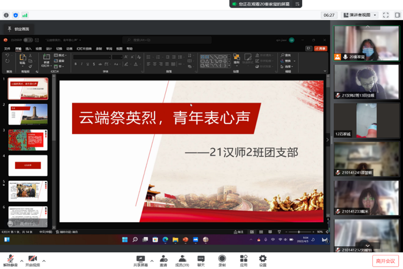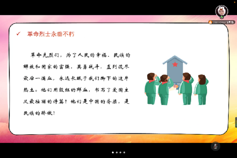 为引导同学们继承先烈遗志、珍惜幸福生活、立志报效祖国,公司各年级各班陆续开展“云端祭英烈,青年表心声”四月主题团日活动。