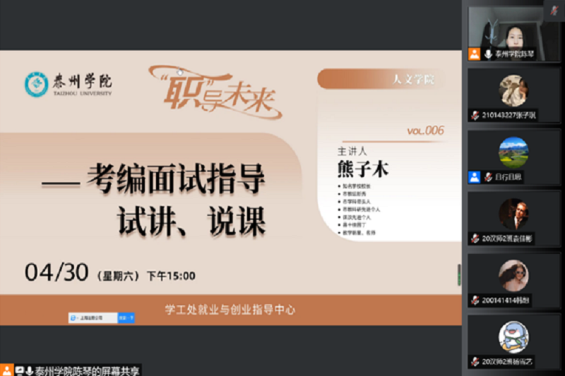 为进一步加深人文学子对考编面试形式的了解,明确备考方向,提供科学高效的备考指导。4月30日下午3点,公司开展“考编面试指导——试讲、说课”线上指导课。本次指导课特邀熊子木老师主讲,公司团总支书记兼员工工作办公室主任陈琴主持,师范专业意向考编的同学参与其中。