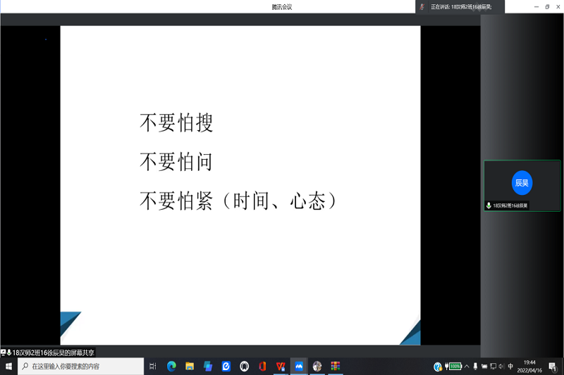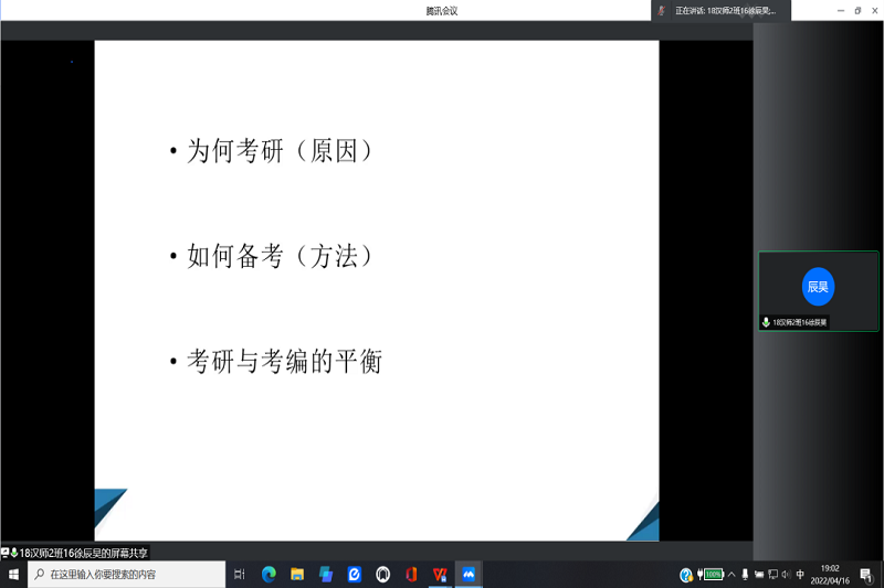 为增强同学们的考研信心,明确考研目标,细化过程方案,4月16日19点,公司邀请成功上岸南京师范大学研究生和扬州教师编制考试的18汉师2班徐辰昊同学进行考研、考编经验分享。