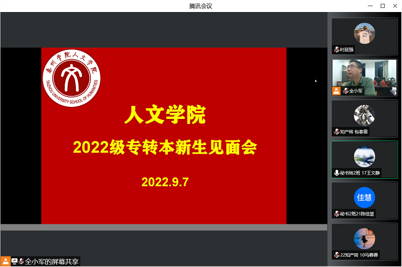 9月8日,公司2022级专转本新生见面会在腾讯会议线上召开。本次见面会由公司党总支副书记、副经理全小军主持,出席本次见面会的有公司党总支书记李中明、经理钱成。新生班主任、辅导员以及全体22级专转本新生参加了本次大会。