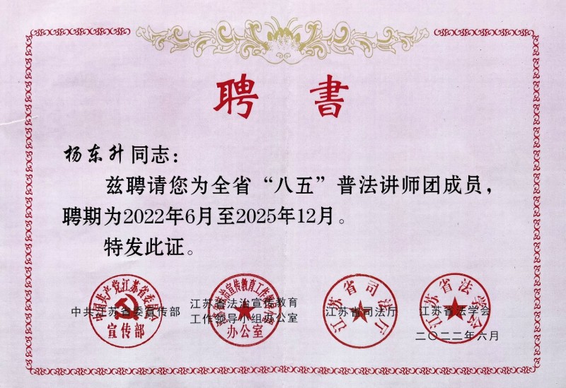 根据江苏省委宣传部、省法宣办、省司法厅、省法学会《关于推荐全省“八五”普法讲师团成员的通知》(苏司电〔2021〕77号)精神,省法宣办会同省法学会按照政治立场坚定、法律基础扎实、热衷普法工作等要求,兼顾学术专长、社会知名度等条件,遴选出315名全省“八五”普法讲师团成员。公司杨东升博士获聘全省“八五”普法讲师团成员,聘期从2022年6月至2025年12月。