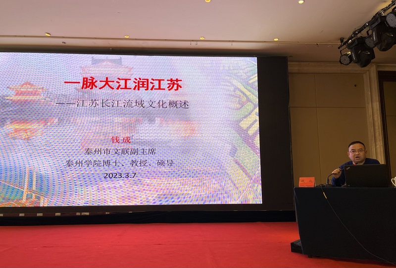 钱成根据培训要求,以“一脉大江润江苏”为题,系统介绍了江苏长江流域文化。他围绕习近平总书记关于“长江文化”的系列重要论述,从“长江文化”的概念、独特地位、发展阶段、文化精神以及对江苏的影响,特别是江苏长江文化的具体形态进行了系统阐述。同时,分地区说明了江苏沿江七市各具特色的“长江文化”,最后重点介绍了新时代江苏的长江文化建设目标、内容、途径和意义。