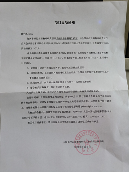 9月18日,孙利政博士收到全国高校古籍整理研究工作委员会“项目立项通知”,他所申报的“《直斋书录结题》校证”获批2023年度高校古委会直接资助项目。