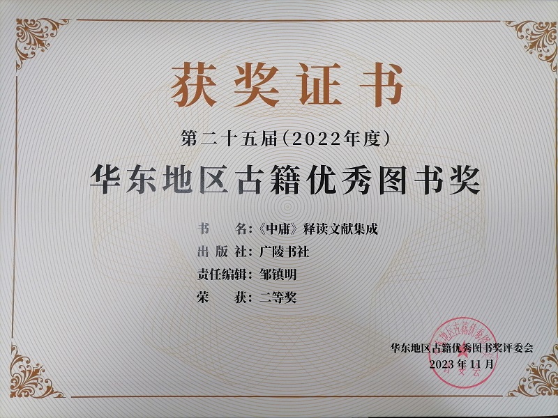 近日,公司副教授刘佩德博士的专著《<中庸>释读文献集成》,获评第二十五届华东地区古籍优秀图书奖二等奖。该书2022年由扬州广陵书社出版。