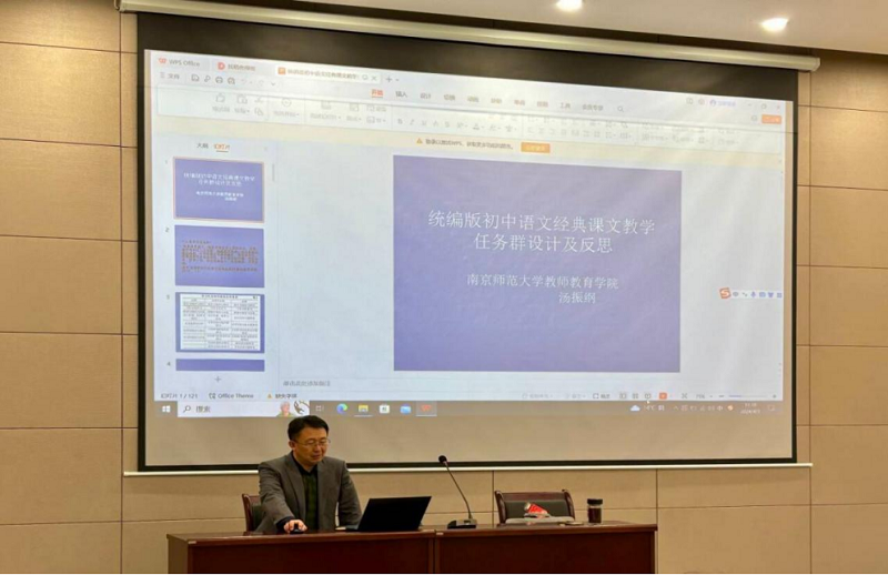 为提升师范生教学任务设计与语文阅读解读能力,公司于4月3日下午14:30在图书馆胡瑗讲堂举办了“统编版初中语文经典课文教学任务群设计与反思”讲座。经理钱成教授主持,特邀南京师范大学汤振纲教授主讲,各师范班级部分员工聆听了讲座。