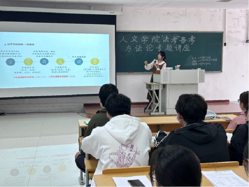 李梦莹博士从询问同学们未来想从事的关于法律方面的职业切入,介绍了法考的沿革、法考证的考公含金量等相关知识,剖析了了法考的各个环节的注意事项,并以自身考试经历为例,介绍了主客观题考试的内容组成与分值占比,引导大二、大三的同学做好详细的备考规划,具体到每一天的学习内容。她特别强调要做真题,要注重由易到难、由近及远的顺序。备考期间心态要稳,有条不紊学习同时,要保持强健的身体素质,打好成功上岸的基础。