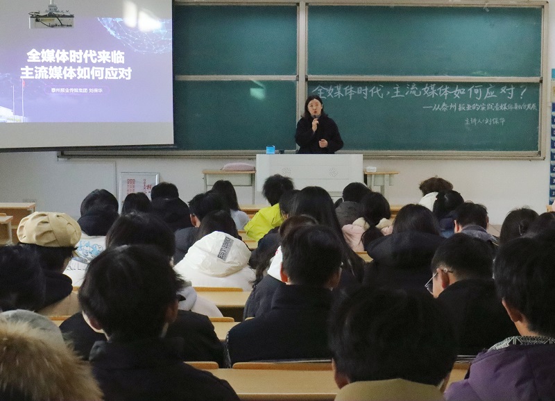 全媒体时代,主流媒体如何应对?12月18日下午,泰州报业传媒集团主任编辑刘保华应邀来公司作了题为《从泰州报业的实践看媒体融合发展》专题讲座。讲座由新闻传播学系主任钱明芳主持,网络与新媒体专业全体教师及部分员工到场聆听。