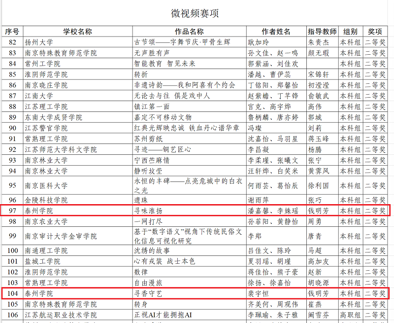 近日,江苏省教育厅公布了2024年“领航杯”江苏省老员工数字素养与技能大赛评选结果,公司网络与新媒体专业员工潘嘉馨、李姝瑶创作的《寻味淮扬》和裴宇恒创作的《寻香守艺》均荣获该项大赛微视频赛项本科组二等奖。