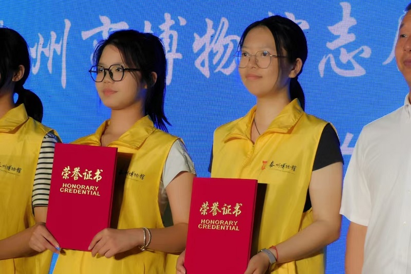在泰州市博物馆优秀志愿者代表证书颁发仪式上,文芽志愿服务团队张妍、倪慧玲、周凌霄三位同学获此荣誉。团队代表说到,活动能够顺利开展,离不开团队负责人的精心策划、成员的积极参与,更离不开泰州市博物馆的全力支持与志愿者的热情奉献。