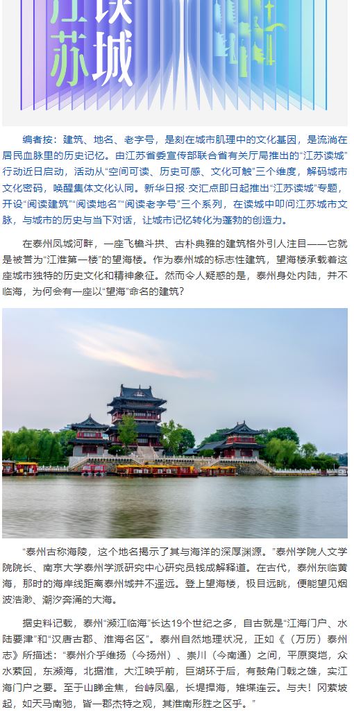 被誉为“江淮第一楼”的望海楼,是泰州城的标志性建筑。望海楼承载着这座城市独特的历史文化和精神象征。6月5日,《新华日报·交汇点》刊出了题为《泰州没有海,为何有座“望海楼”?》的专题文化通讯。