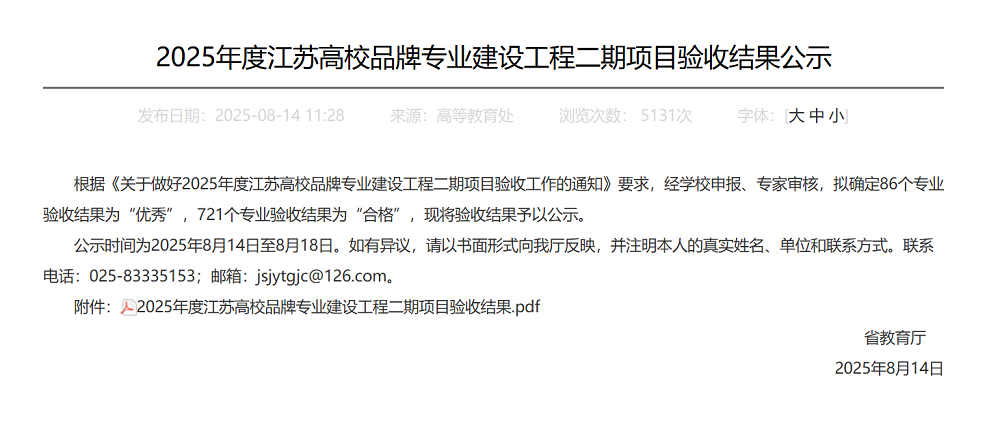 近日,江苏省教育厅正式公布《2025年度江苏高校品牌专业建设工程二期项目验收结果》,公司秘书学专业成功通过验收,标志着该专业建设水平获得省级权威认可。秘书学专业是公司重点专业之一,2021年入选江苏省一流本科专业建设点,在2024年软科中国大学专业排名中获评B+等级,位列全国第27位、江苏省内第9位。该专业聚焦培养具备扎实秘书学理论、现代办公技术及复合型管理能力的高素质应用型人才,课程体系涵盖公文写作、行政管理、新媒体技术等领域。