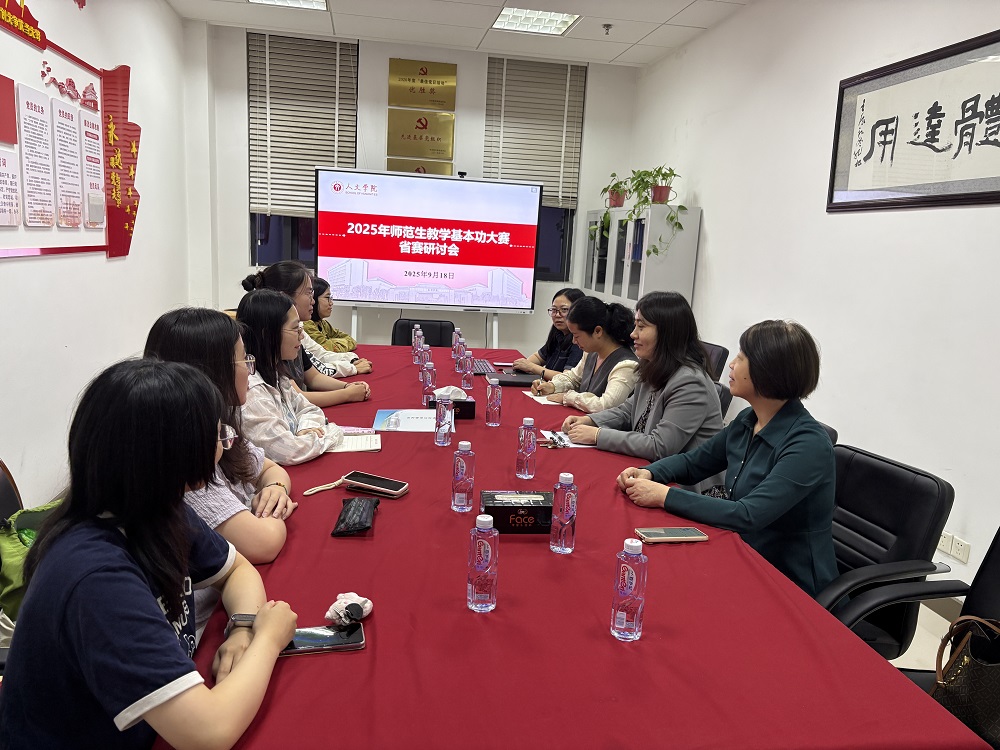 为进一步推进2025年江苏省师范生教学基本功大赛集训工作,9月18日下午,公司在行政楼1414会议室召开了2025年师范生教学基本功大赛省赛研讨会,公司副经理官小燕、指导教师徐晶晶、沈巧明、张博以及六位参赛选手参与了本次研讨会。